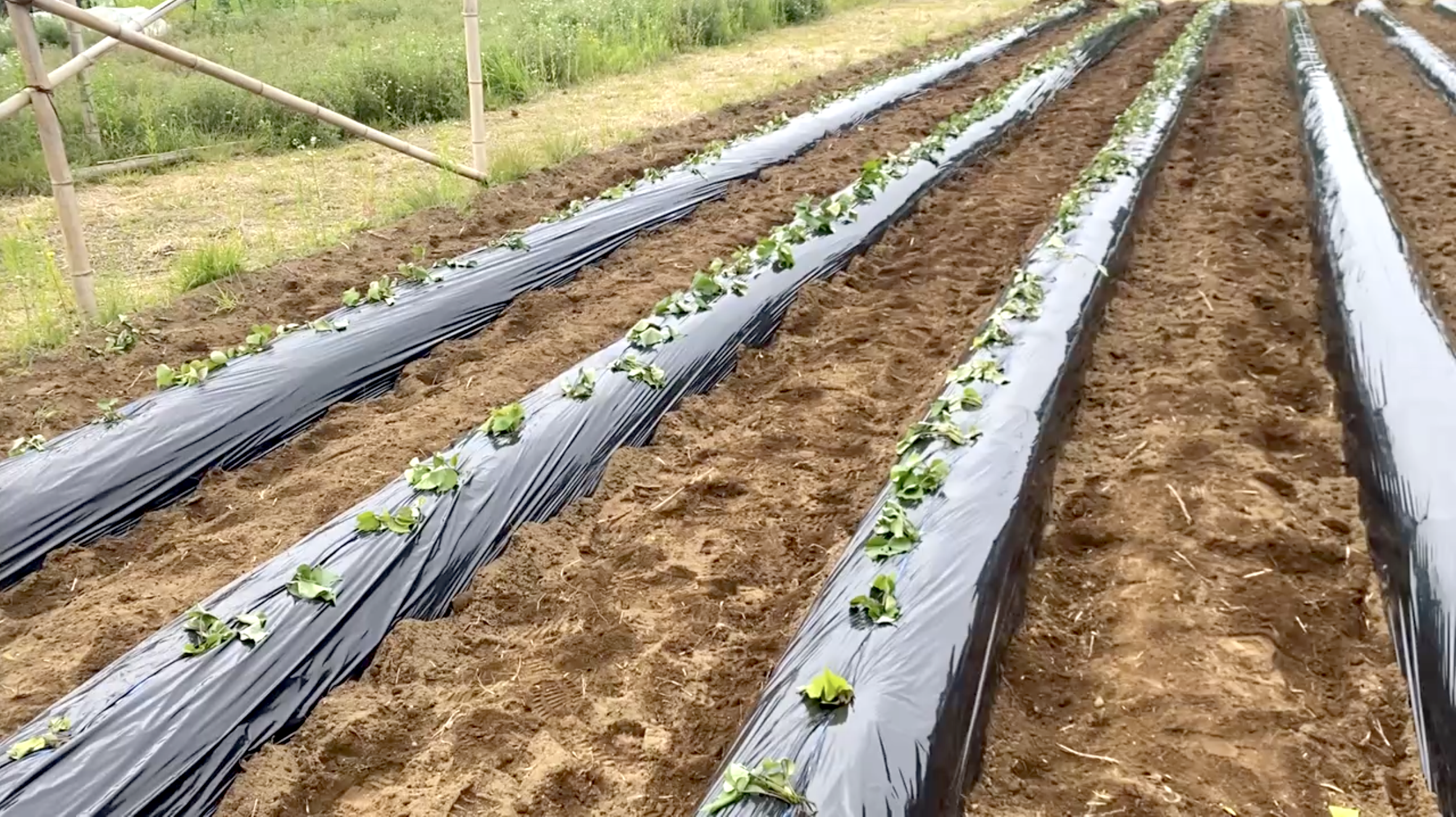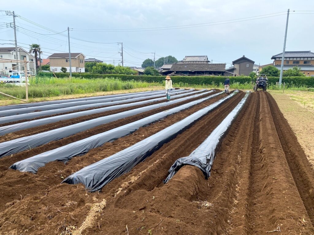 6月の活動日、畝を立ててビニルマルチを張って最初の苗を植えました♪